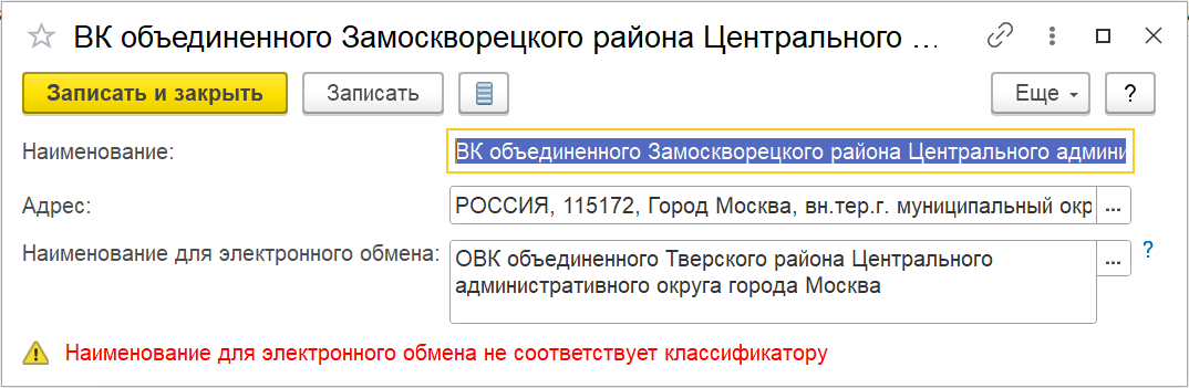 В справочник военкоматов добавлено поле "Наименование для электронного обмена", с выбором из списка. Добавлен классификатор военкоматов. Если наименование для электронного обмена не заполнено, при формировании файла используется просто наименование. Если Наименование для электронного обмена (или Наименование) не соответствует классификатору, выводится предупреждение.