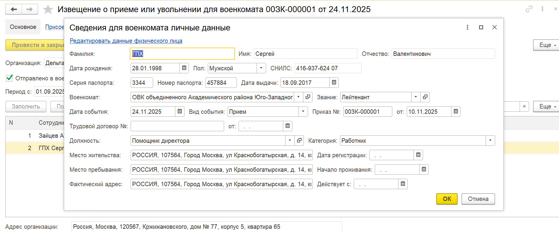 При нажатии на гиперссылку открывается документ "Извещение о приеме или увольнении для военкомата", заполненный найденными сотрудниками.