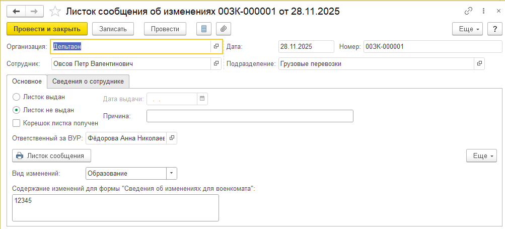 Если листок уже включен в документ Изменение сведений, второй раз он в автозаполнение не попадает (если документ Изменение сведений проведен и установлен признак Отправлено в военкомат).
