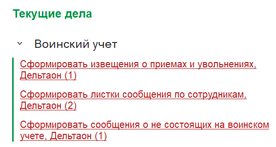 Если найдены сотрудники, по которым требуется отправить данные в военкомат, в списке "Текущие дела" выводится сообщение формата "Сообщить о подлежащих постановке на воинский учет гражданах, <Организация>, <КоличествоСотрудников>".