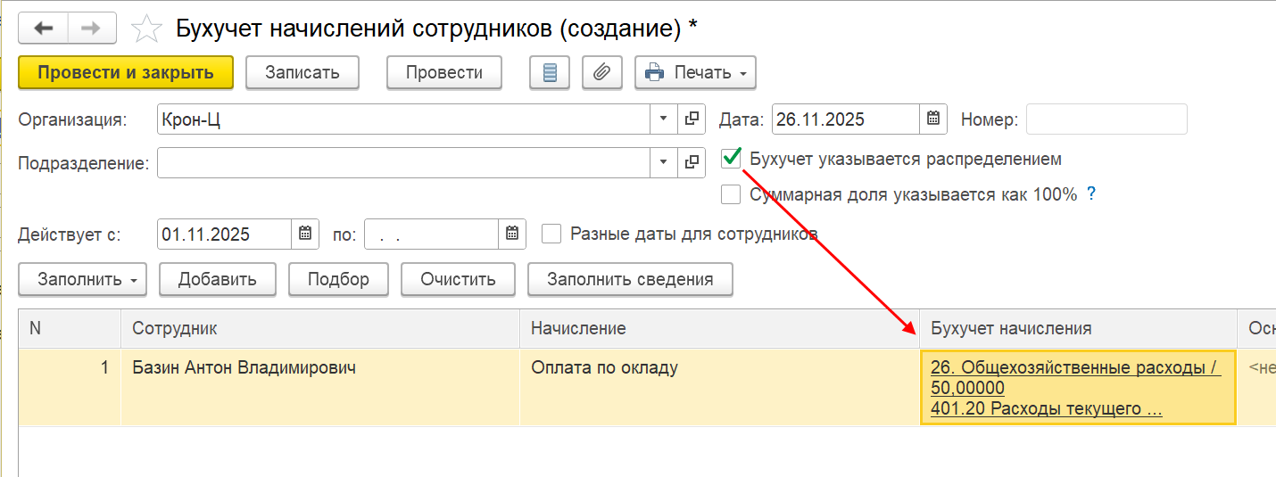 Добавлена возможность в документе "Бухучет начислений сотрудников" указывать бухучет начисления как распределение.