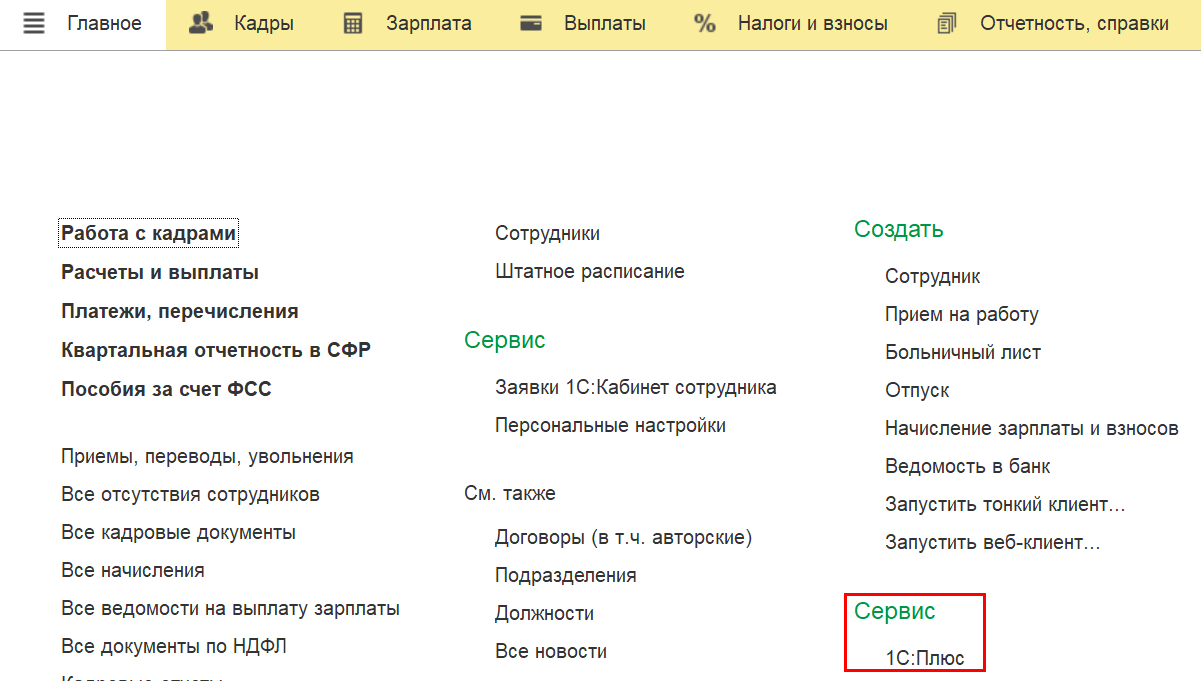 Реализована интеграция с сервисом 1С:Плюс. Ссылка размещена в разделе Главное – Сервис.