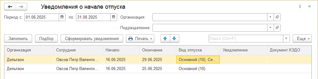 Кнопка "Сформировать уведомления" создает документы "Уведомления о начале отпуска". Если КЭДО включен, то сразу создаются документы КЭДО и регистрируются к отправке.