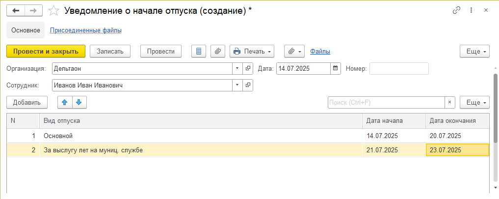 Новый документ "Уведомление о начале отпуска" также имеет печатную форму уведомления.