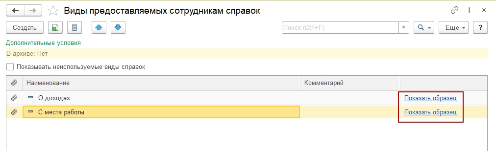 В форме элемента справочника «Виды предоставляемых сотруднику справок» можно указать, какой шаблон будет использоваться для формирования справки. Есть два варианта: