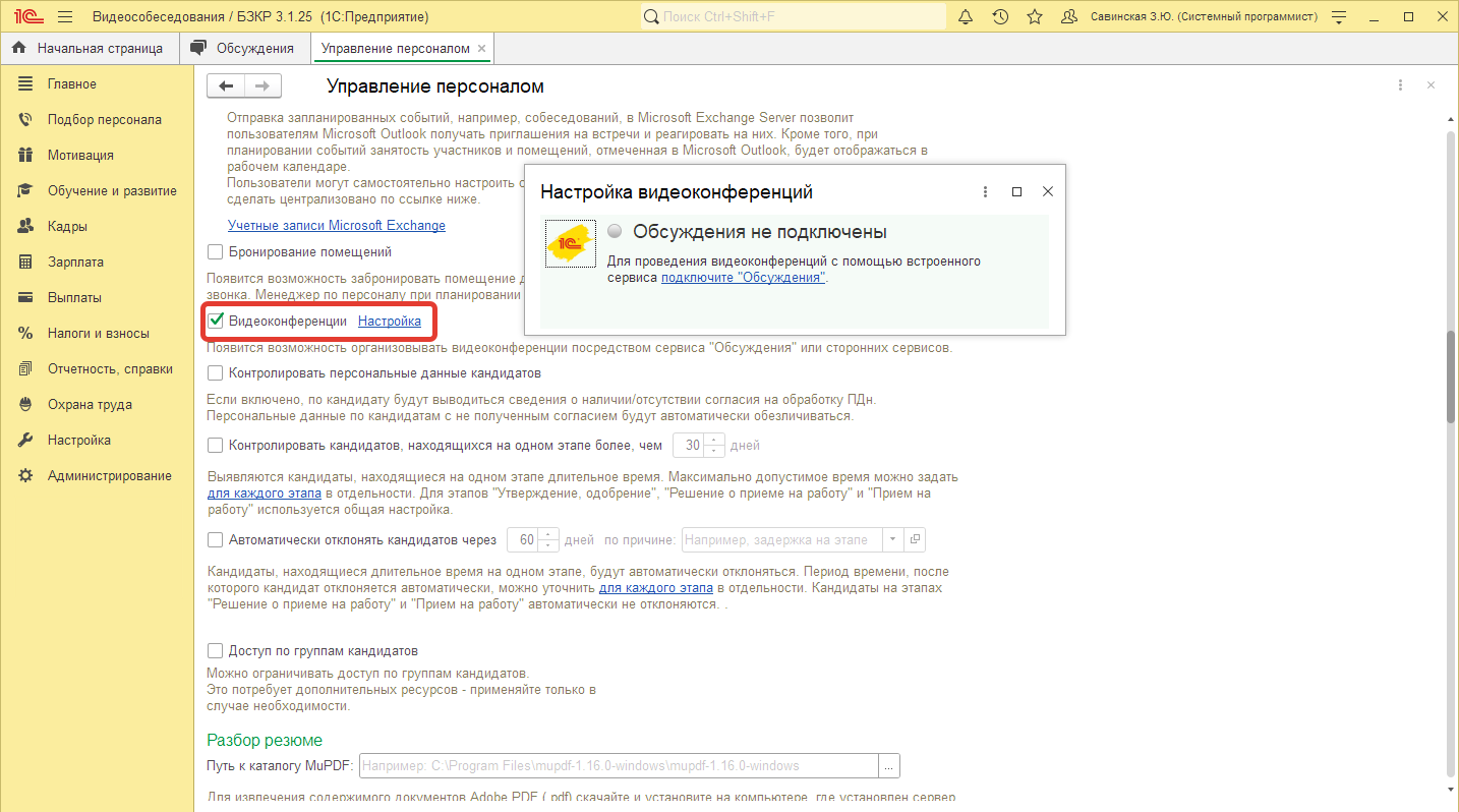 Чтобы её использовать, необходимо установить флажок Настройки -> Управление персоналом -> Видеоконференции.