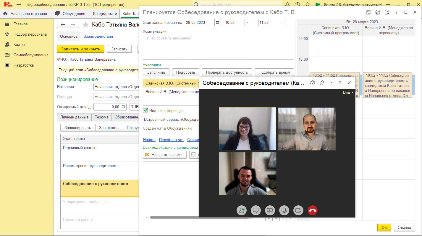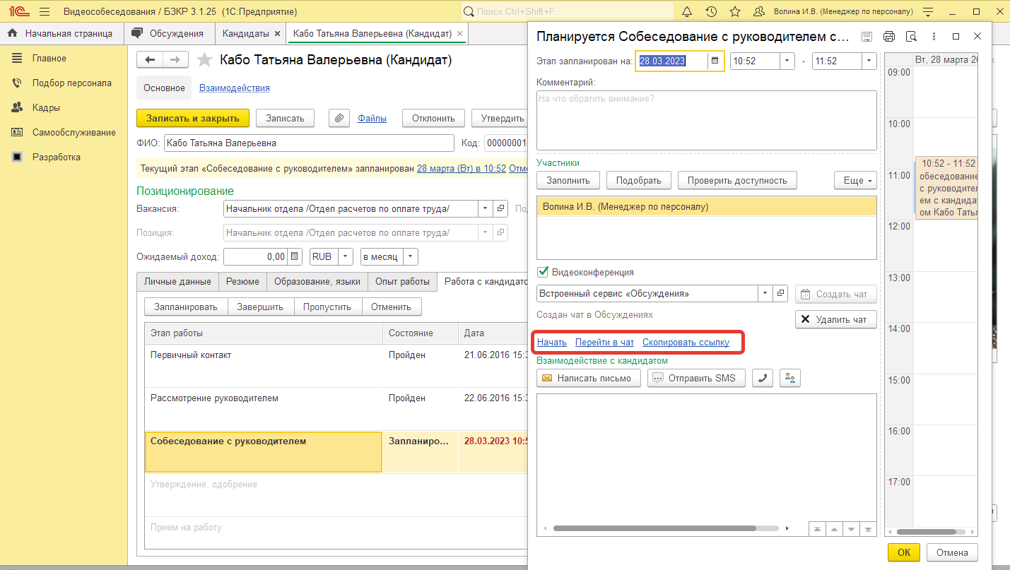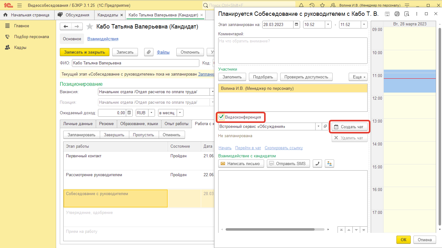 При планировании этапа работы с кандидатом появляется функция организации видеоконференции или чата с возможностью видеозвонка.