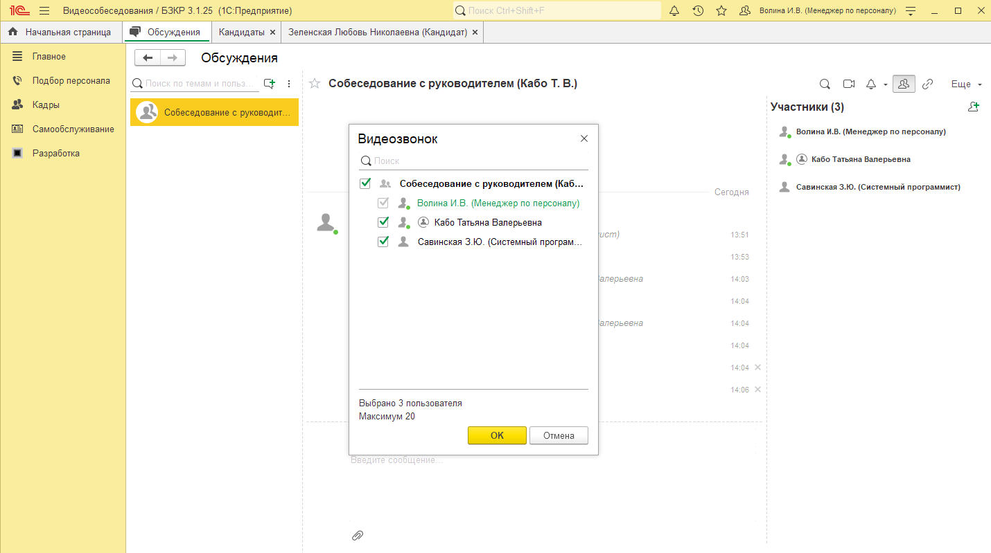 Кроме того, в 1С:ЗУП КОРП можно организовывать видеособеседования при помощи сервиса Zoom. Настройка и использование аналогичны Системе Взаимодействия.