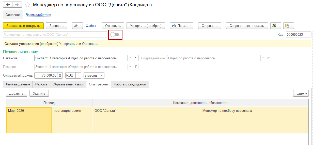 В дальнейшем, когда ФИО кандидата станет известно, нужно будет включить переключатель и заполнить ФИО.
