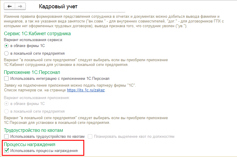 В настройки кадрового учета добавлена настройка "Использовать процессы награждения".