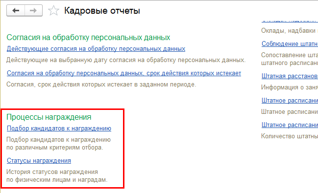 После её включения в разделе Кадры отображается подраздел "Процессы награждения" со всеми новыми объектами.