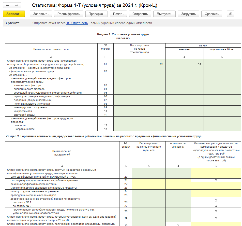 Реализовано автоматическое заполнение формы 1-Т (условия труда).