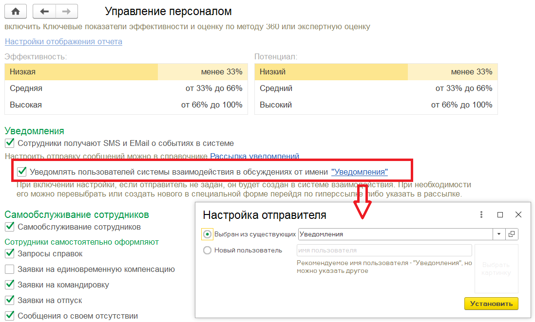 Для этого, необходимо установить флаг «Уведомлять пользователей в обсуждениях от имени настроить». При включении данной настройки, в системе будет создан предопределенный отправитель "Уведомления".