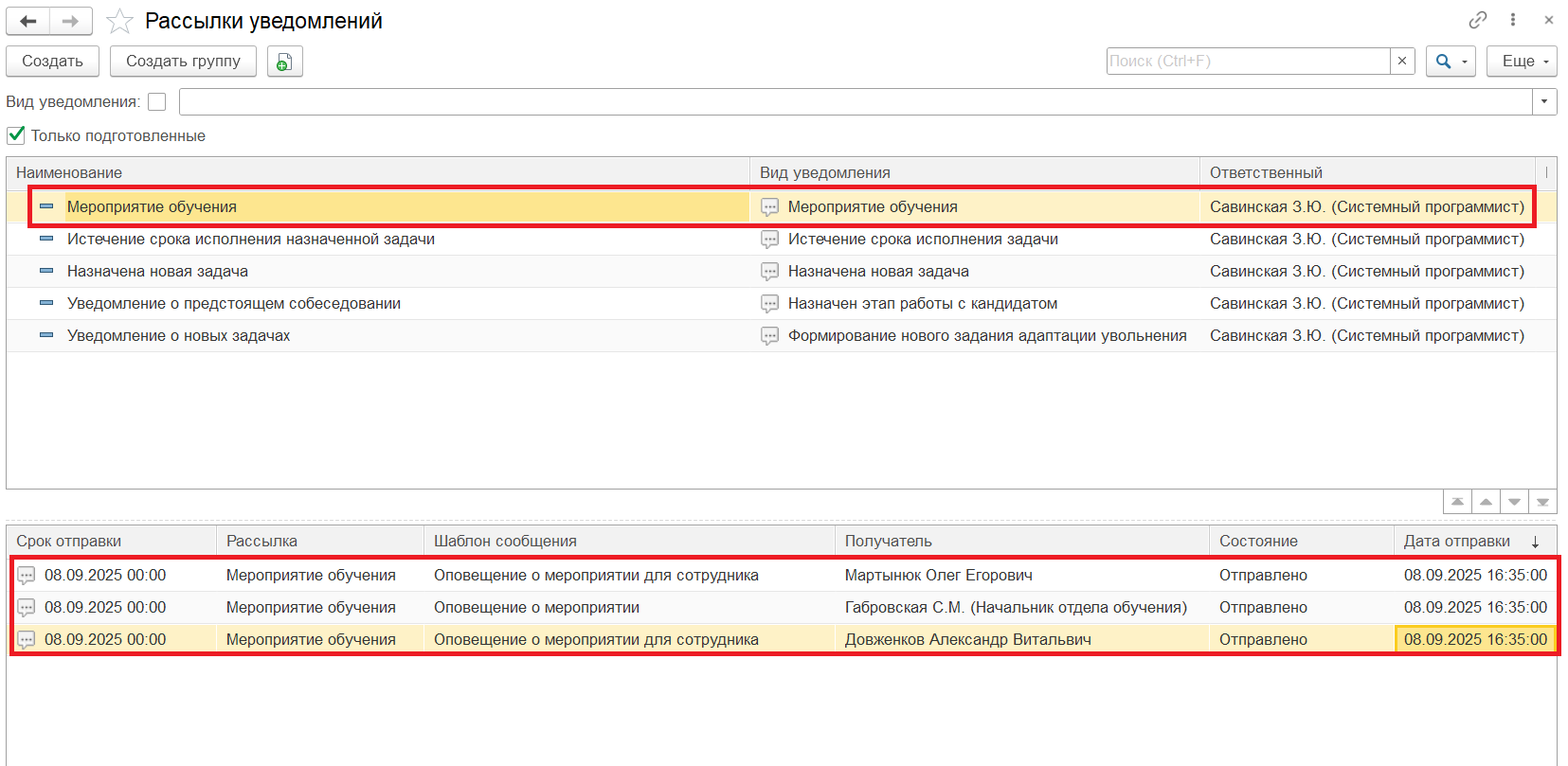 В разделе "Кого уведомлять" при нажатии на гиперссылку "Дополнительные получатели" откроется форма для указания фиксированных получателей. После заполнения рассылки, необходимо установить флаг "Подготовлена". Далее, необходимо создать документ «Обучение сотрудников» и провести его.