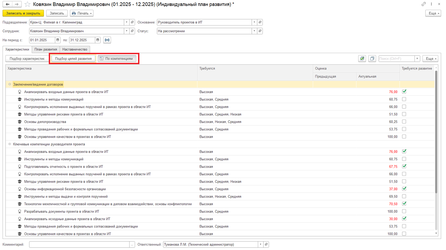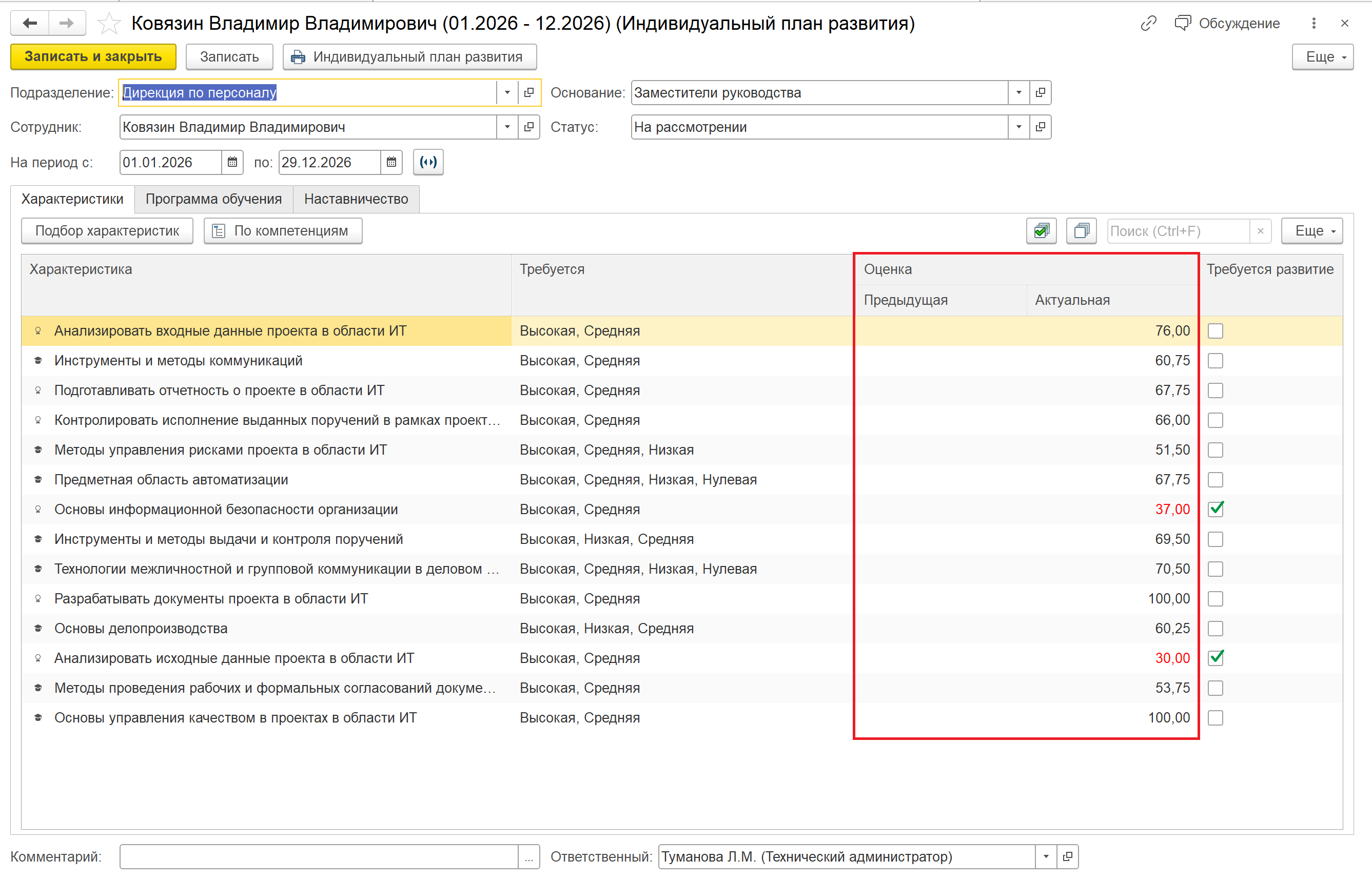 Таблица характеристик в справочнике “Индивидуальные планы развития” теперь может содержать в себе результаты ранее проведенной экспертной оценки. Если оценка по определенной характеристике, ниже требуемого уровня, она помечается красным цветом, взводится флаг: “Требуется развитие” который в дальнейшем учитывается для формирования программы обучения.