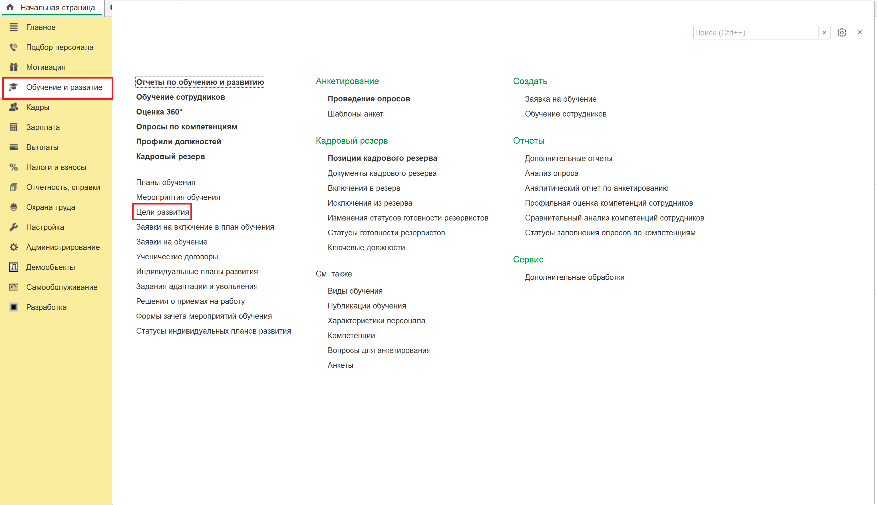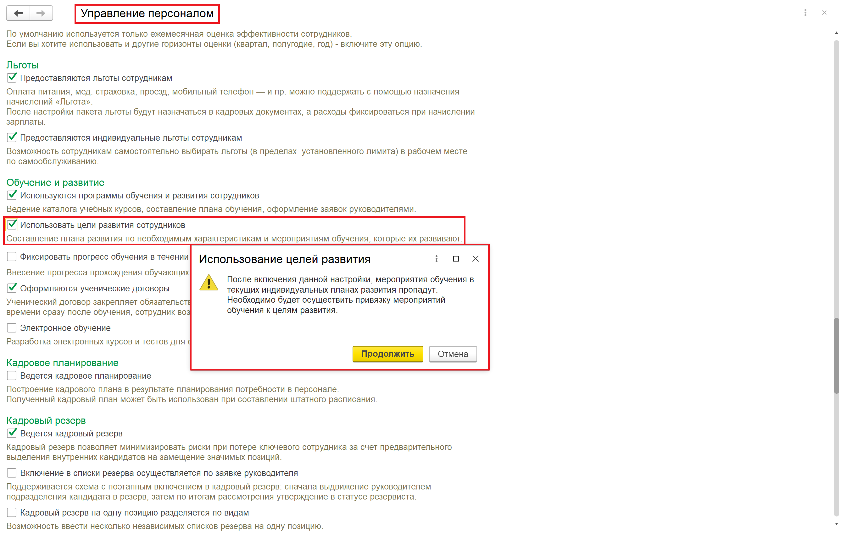 Включение целей развития осуществляется в разделе Настройки Управление персоналом Обучение и развитие.
