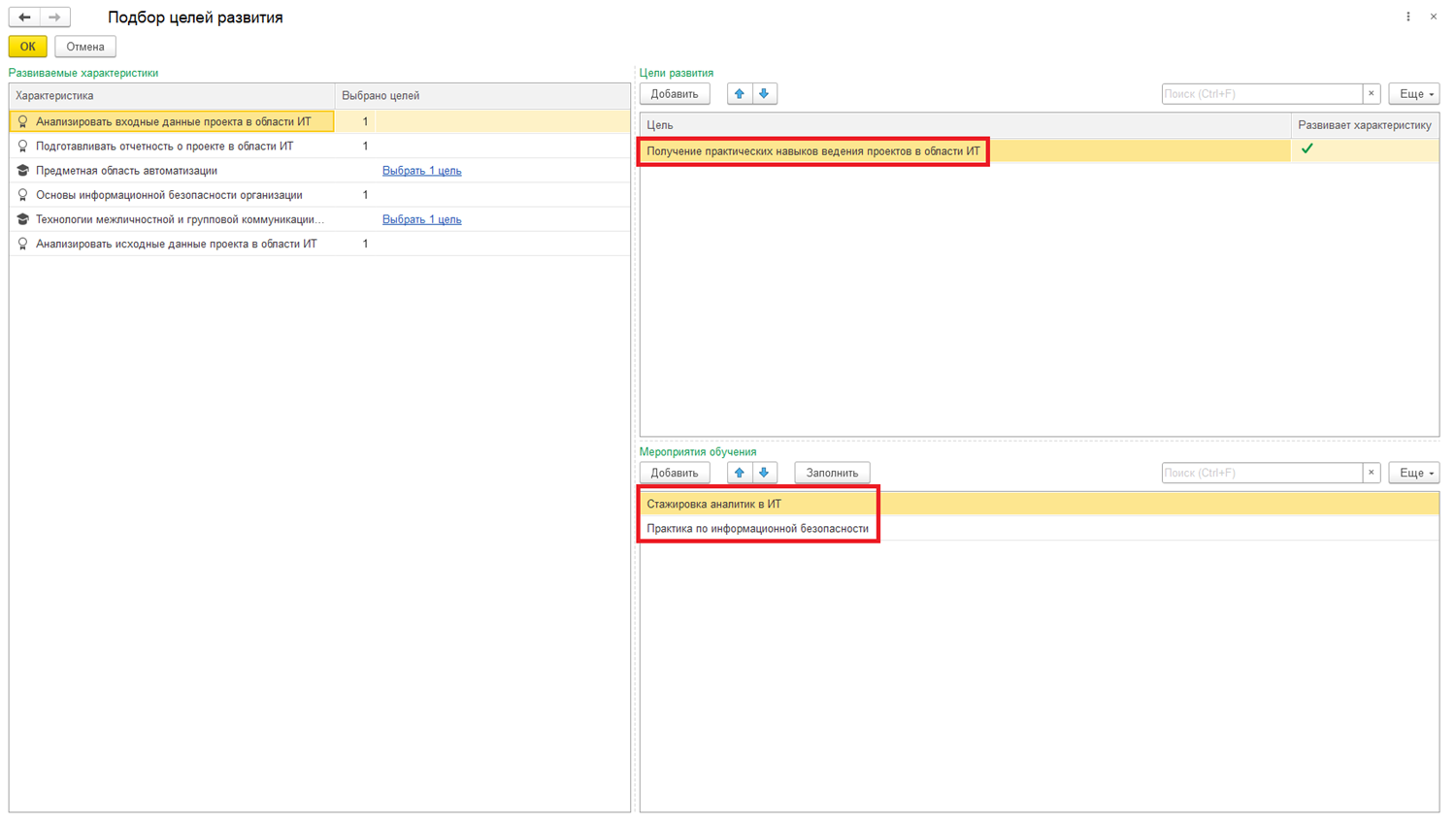Характеристики, которые требуют развития, попадают в форму подбора целей и мероприятий для нашего ИПР: