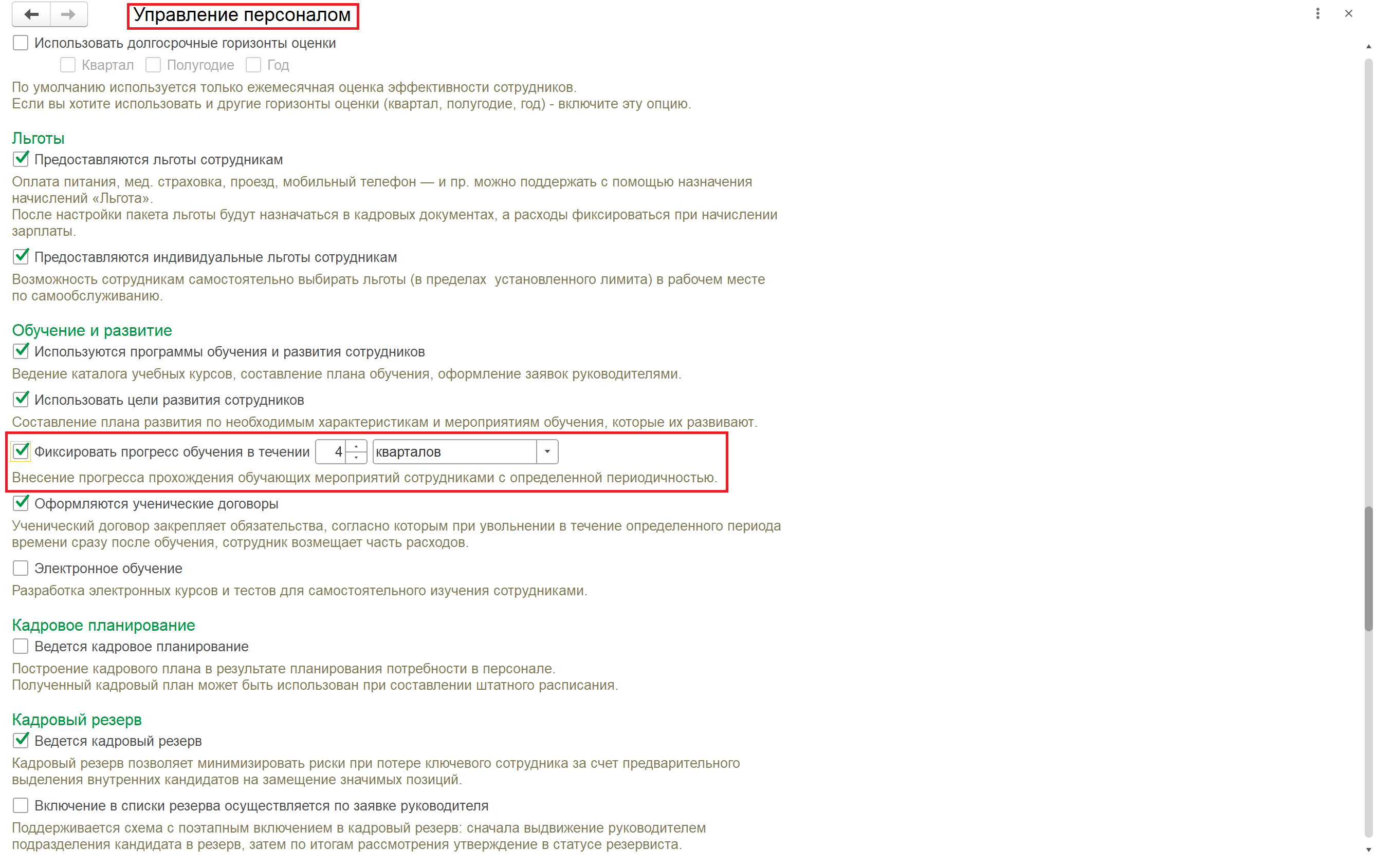Включение прогресса обучения осуществляется в разделе Настройки Управление персоналом Обучение и развитие.
