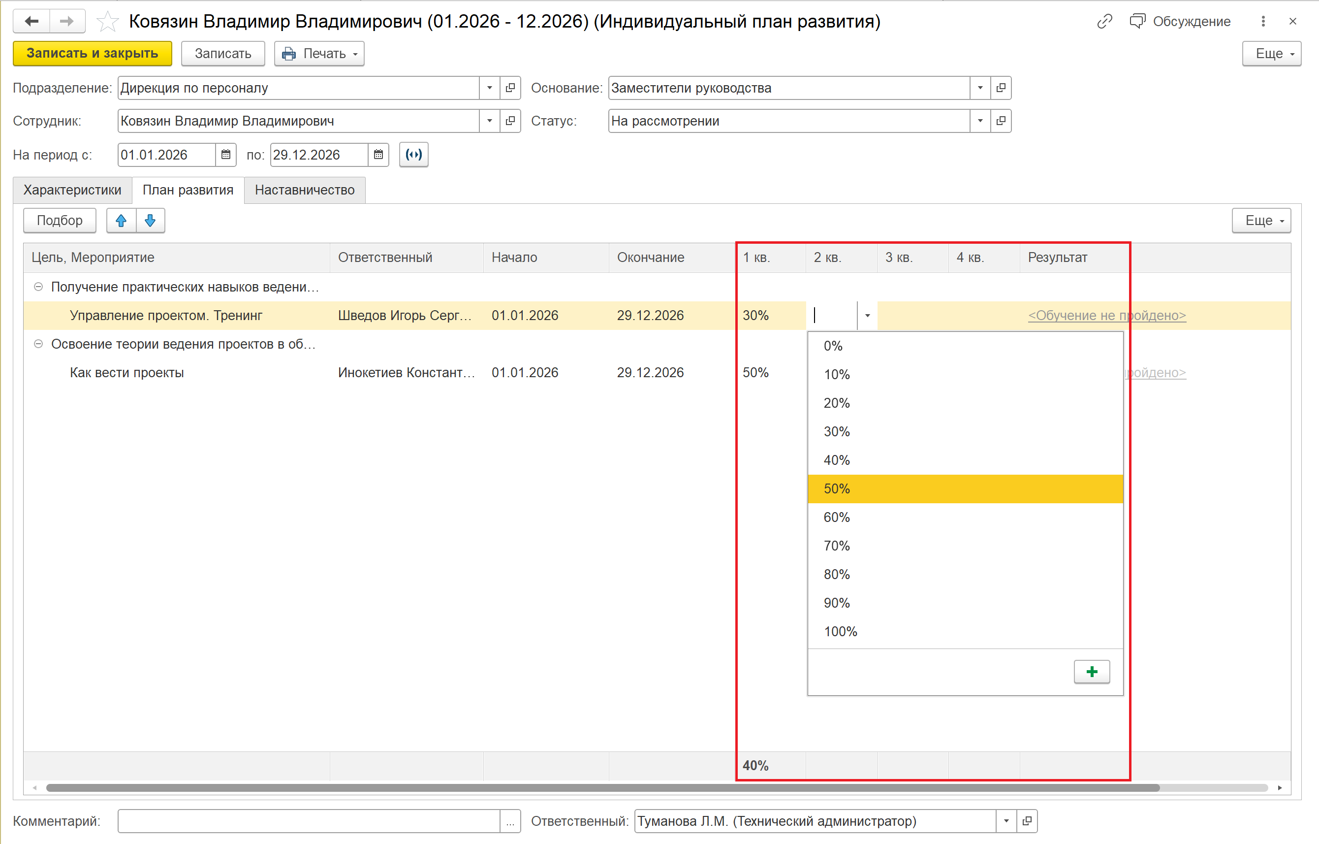 После включения, в ИПР появиться возможность устанавливать прогресс за каждый период и по каждому мероприятию. Если по всем мероприятиям в периоде прогресс установлен, в подвале списка происходит подсчет общего прогресса.