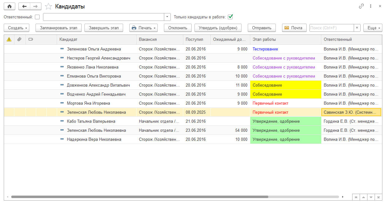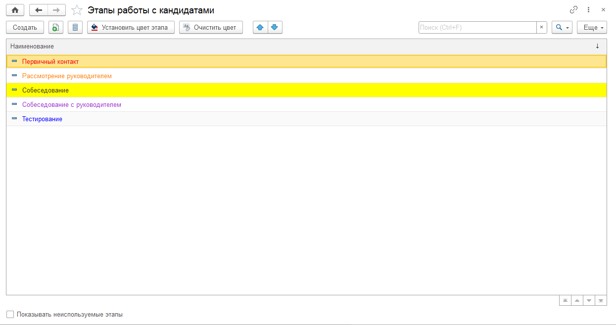 Цветовое оформление применяется на формах справочников «Этапы работы с кандидатами», «Кандидаты» и «Вакансии».