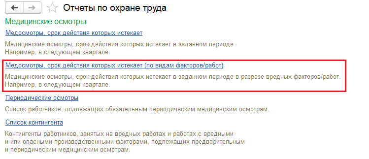 Добавлен отчет по медицинским осмотрам в разрезе вредных факторов/видов работ: "Медосмотры, срок действия которых истекает (по видам факторов/работ)".