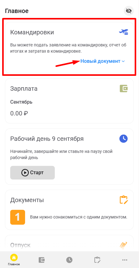 новый раздел «Командировки», где возможно подавать заявления на командировку.