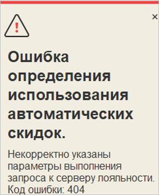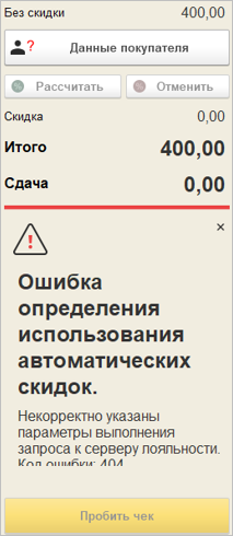 Если в момент расчета скидки возникли проблемы соединения с сервером лояльности, то программа оповестит об этом пользователя.