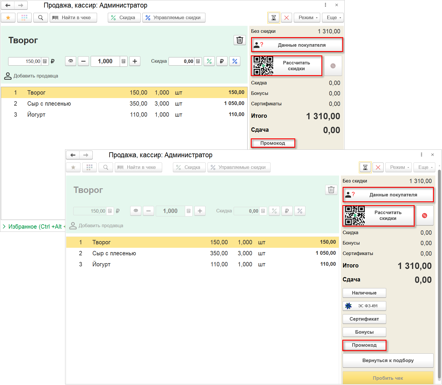 Сделали более понятной последовательность действий при вводе маркетинговых данных. Теперь пользователь может управлять скидками, промокодами и картами лояльности не только на этапе ввода товаров, но и в режиме оплаты.