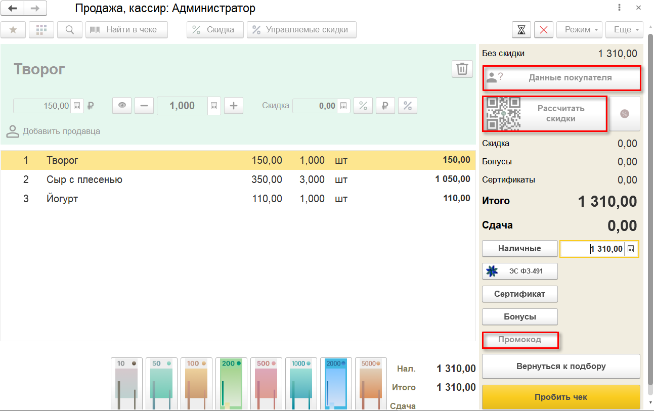 Теперь при оформлении продажи можно рассчитать скидки путем сканирования QR-кода, расположенного на кнопке Рассчитать скидки. При этом кассиру не потребуется переключаться в режим работы с мышью, что позволит оперативнее оформить оплату покупателя.