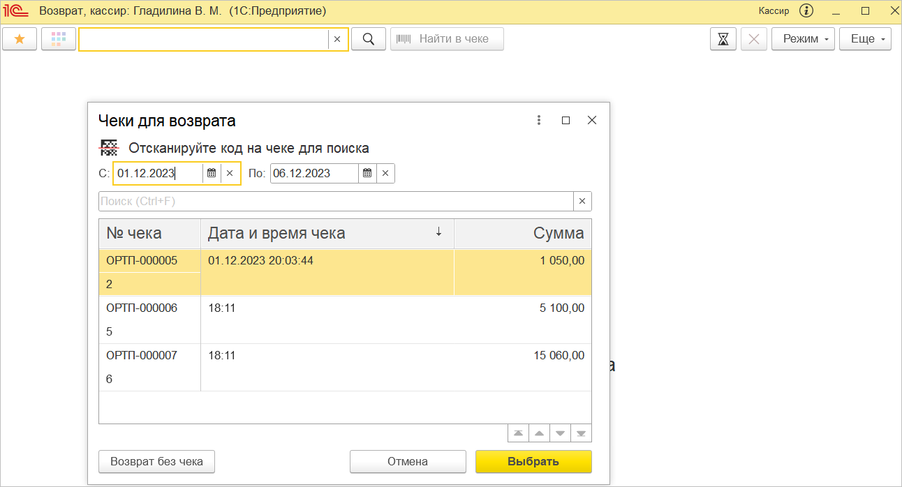 Сделали удобнее поиск отложенных чеков и чеков на возврат. Теперь при поиске можно задавать период. Искать чек можно по номеру в программе и по номеру, присвоенному ККМ, в том числе с помощью поиска по строке.