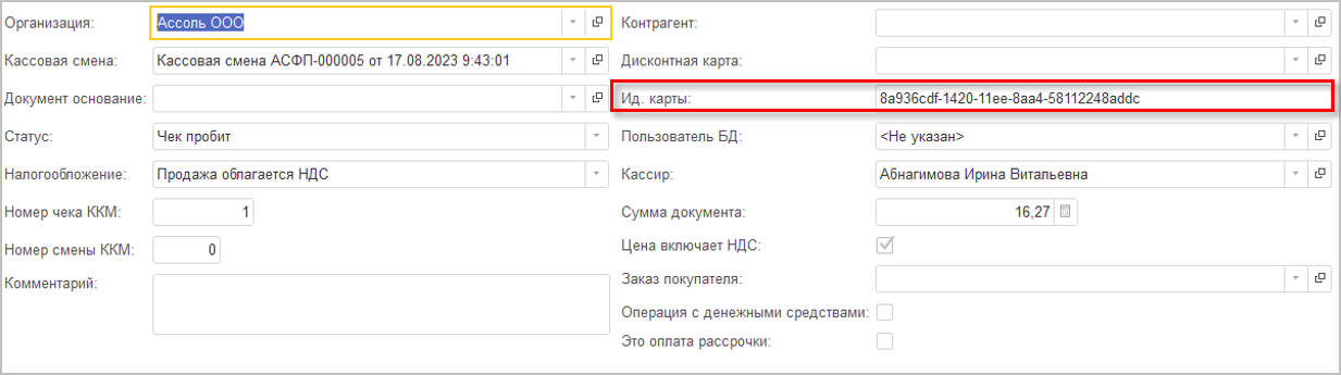 Если используется сервер лояльности, то поиск карты будет осуществляться по идентификатору владельца. В пробитом чеке отобразится идентификатор карты, полученный с сервера лояльности.