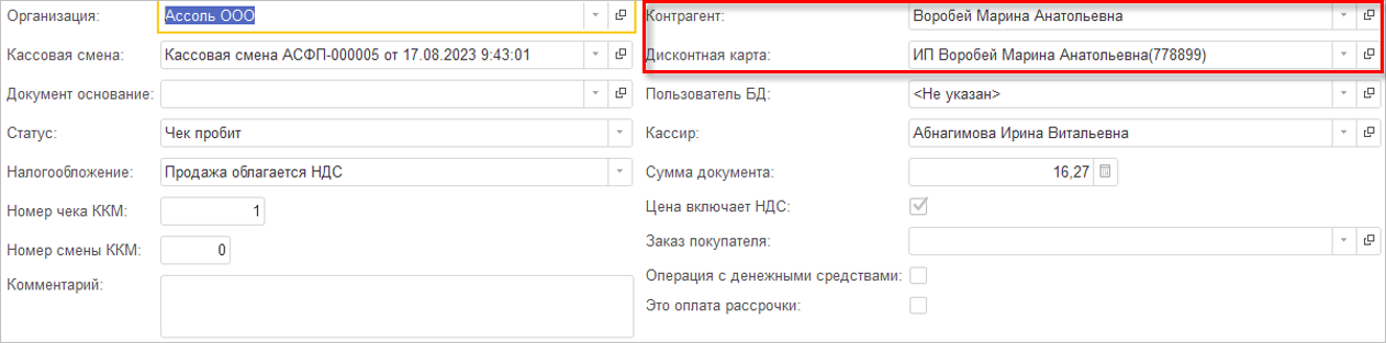 Информацию о картах лояльности и их владельцах можно хранить и в самой базе 1С:РМК, загрузив их из управляющей системы. Для этого в настройке обмена на стороне управляющей системы необходимо включить флажок "Выгружать карты лояльности". Кассир сможет быстрее находить нужную карту покупателя, отсканировав ее в любое время. При этом потребуется больше дискового места для хранения информации. В пробитом чеке все данные о карте лояльности отобразятся в соответствующих полях.