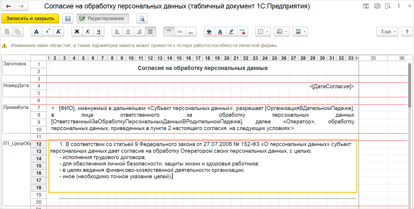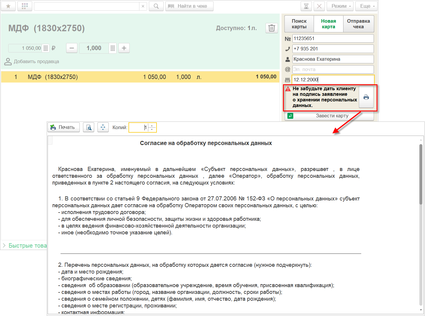 На форме проверки реквизитов создаваемой дисконтной карты будет выведено информационное сообщение с напоминанием о необходимости получить письменное согласие на обработку персональных данных и кнопка печати бланка. Субъектом разрешения в документе автоматически будет указан контрагент-владелец дисконтной карты.