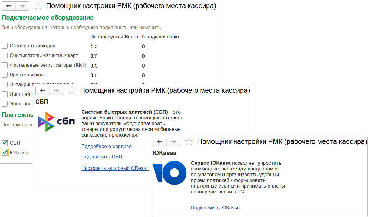 Упрощено заполнение настроек СБП и ЮKassa в помощнике подключения кассового места. В раздел "Виды оплат" добавлен признак "Использовать платежный системы (СБП, ЮKassa)", после установки которого будут отображаться виды оплаты с признаком "Платежная система".