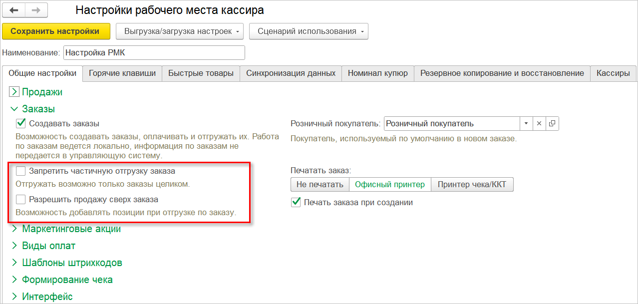 В раздел "Заказы" настроек РМК добавлены новые опции для запрета частичной отгрузки товаров по "Заказу покупателя" и продажи товаров, не входящих в состав документа-основания.