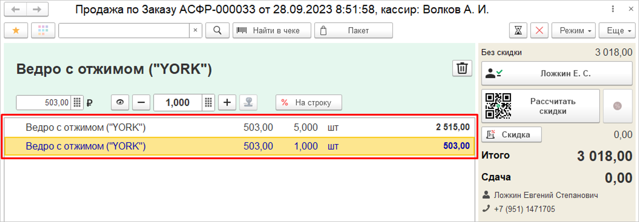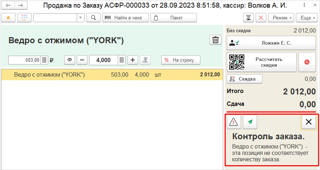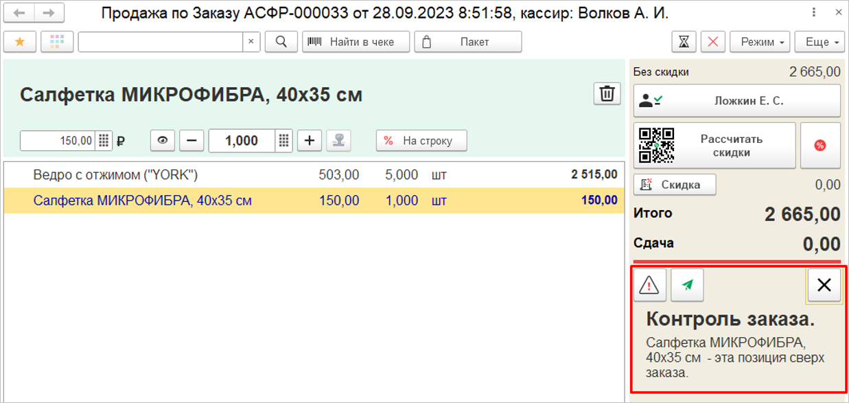 Добавление позиции в чек "сверх" заказа происходит всегда добавлением новой строки, даже если в заказе есть добавляемая номенклатура. Строки "сверх"заказа помечаются синим цветом текста.