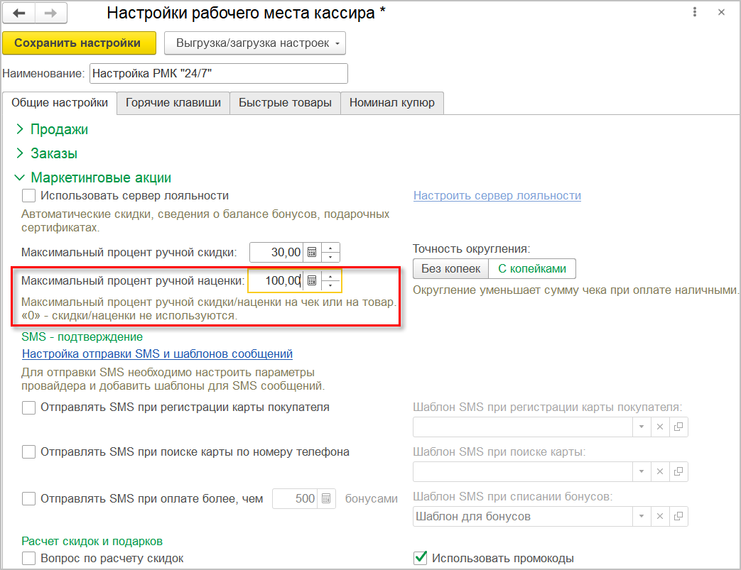 Максимальный размер ручной наценки можно ограничить в разделе "Маркетинговые акции" настроек РМК.