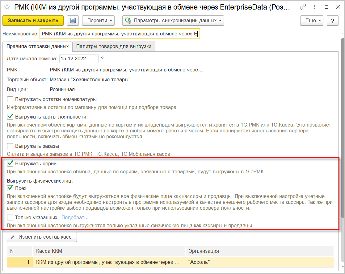 При обмене с Розницей 3.0 и УНФ 3.0 добавлена возможность регулировать загрузку серий номенклатуры и физических лиц. Чтобы не утяжелять базу 1С:РМК можно отключить регистрацию к обмену этих справочников, а в самом 1С:РМК получать данные через сервер лояльности. После выгрузки данных в управляющую систему такие реквизиты документов, как серия, автор, ответственный будут заполнены автоматически по идентификатору, присвоенному в 1С:РМК.