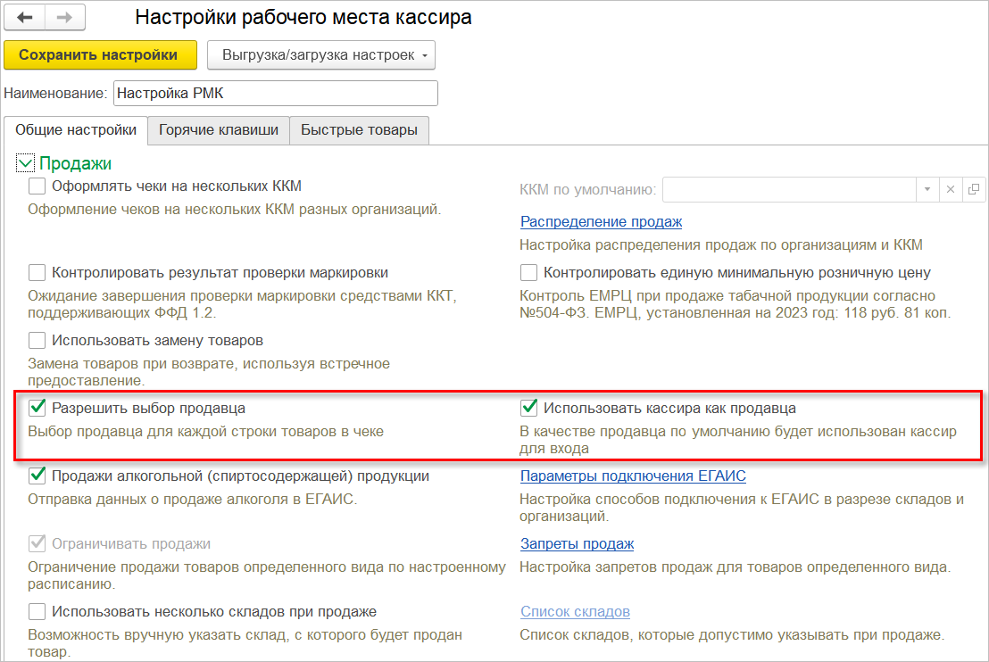 Дополнительно можно устанавливать значение по умолчанию, если авторизованный кассир является продавцом. Для этого должен быть установлен одноименный флажок в разделе "Продажи" настроек РМК.