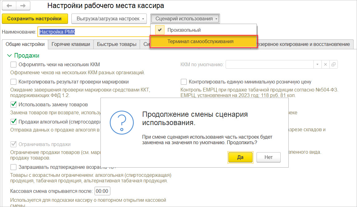 При настройке кассы можно выбрать сценарий работы «Терминал самообслуживания». При этом помощник настройки РМК самостоятельно выставит нужные значения некоторых настроек и скроет лишние.