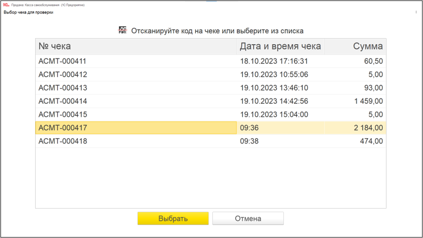 Дополнительно можно найти чек сканированием фискального признака или идентификатора оплаты платежной системы. При предъявлении дисконтной карты отображаются чеки покупателя за 3 последних месяца.