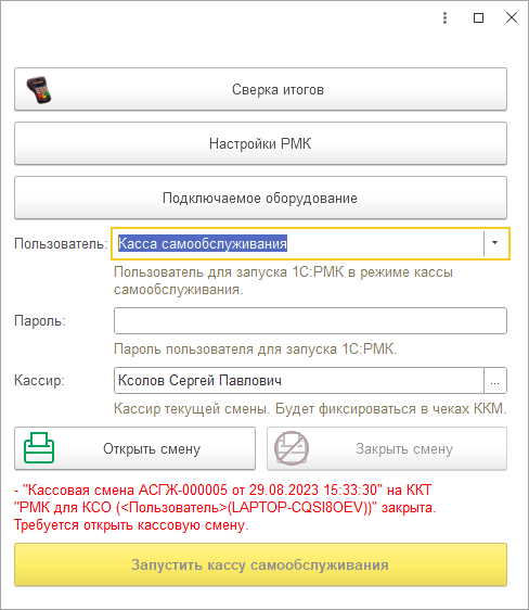 Администратор с полными правами из меню РМК сможет поправить настройки РМК, настроить оборудование, сверить итоги, открыть и закрыть смену и запустить кассу в режиме самообслуживания. Обычный кассир сможет открыть и закрыть смену и запустить КСО, а старший кассир – дополнительно сверить итоги.