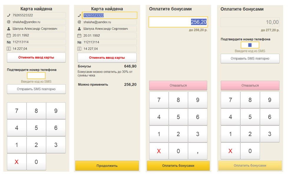Данные дисплея покупателя стали информативнее. Теперь на экране отображается информация по выбранной карте лояльности: номер карты, последние цифры телефона владельца, общая сумма продаж по карте, остатки бонусных баллов и сумма покупки, которую можно ими оплатить.