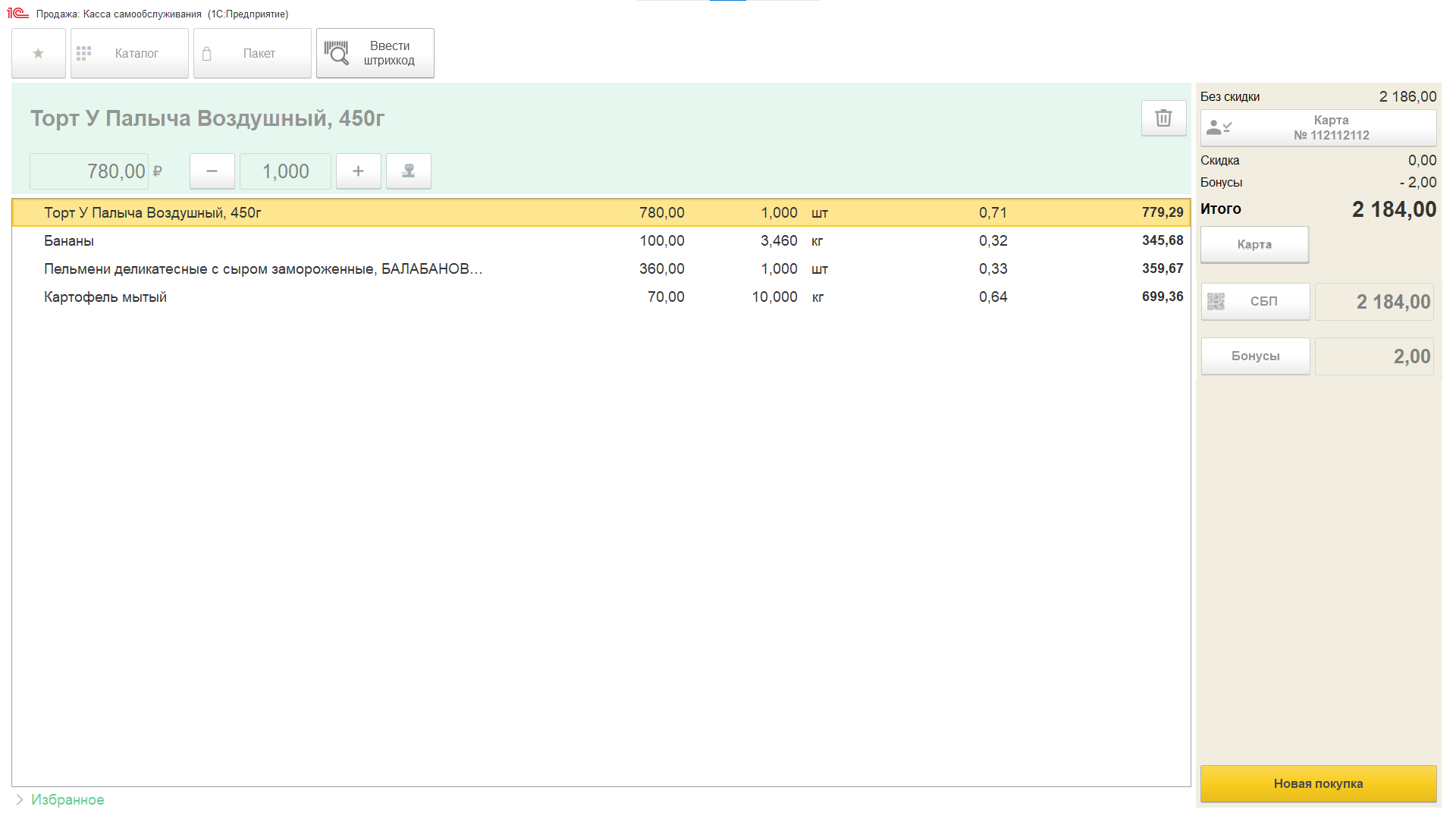 По мере формирования покупки покупатель может добавить упаковочные пакеты. В режиме КСО поддерживается идентификация покупателя по дисконтной карте с авторизацией по СМС-коду. Для авторизованного покупателя доступно начисление и списание бонусов, расчет персональных скидок.
