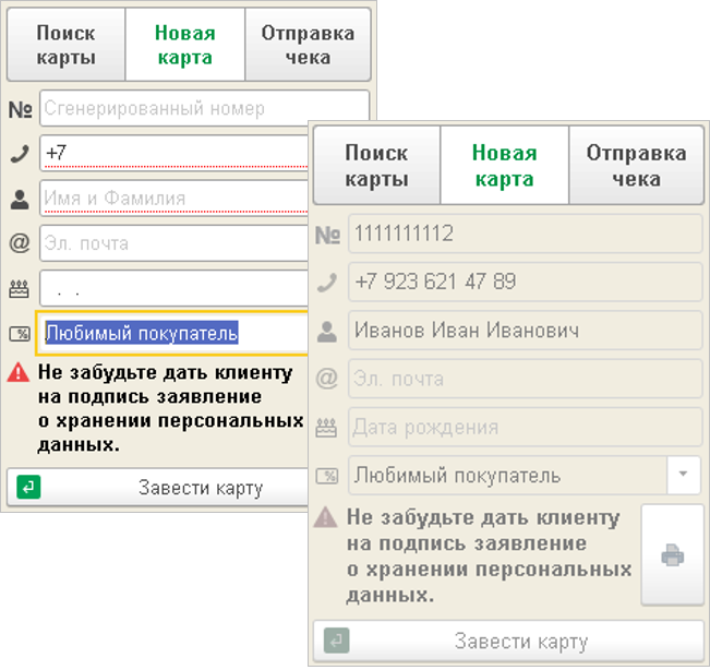При выборе именного вида дисконтной карты с возможностью генерации номера обязательным для заполнения становятся "номер телефона" и "ФИО". В подсказке номера карты будет написано «Сгенерированный номер». После нажатия команды «Завести карту» на стороне управляющей базы по определенным правилам будет сгенерирован номер карты. Возвращенный с сервера лояльности номер будет установлен в номер карты.