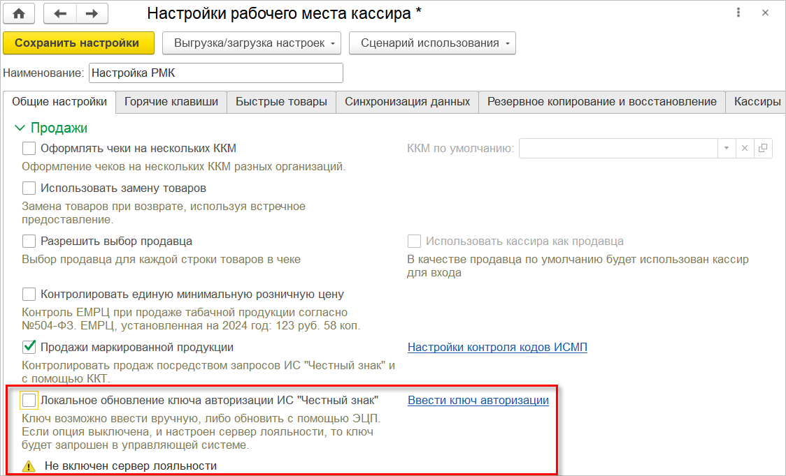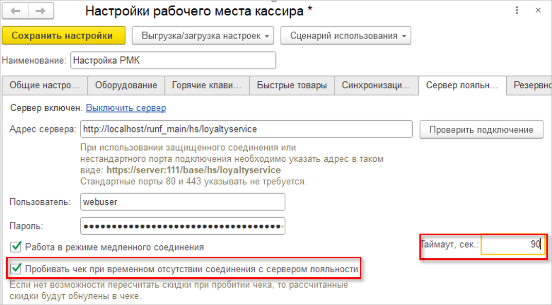 В помощник настройки кассового места и настройки РМК на странице «Сервер лояльности» добавлены следующие параметры: