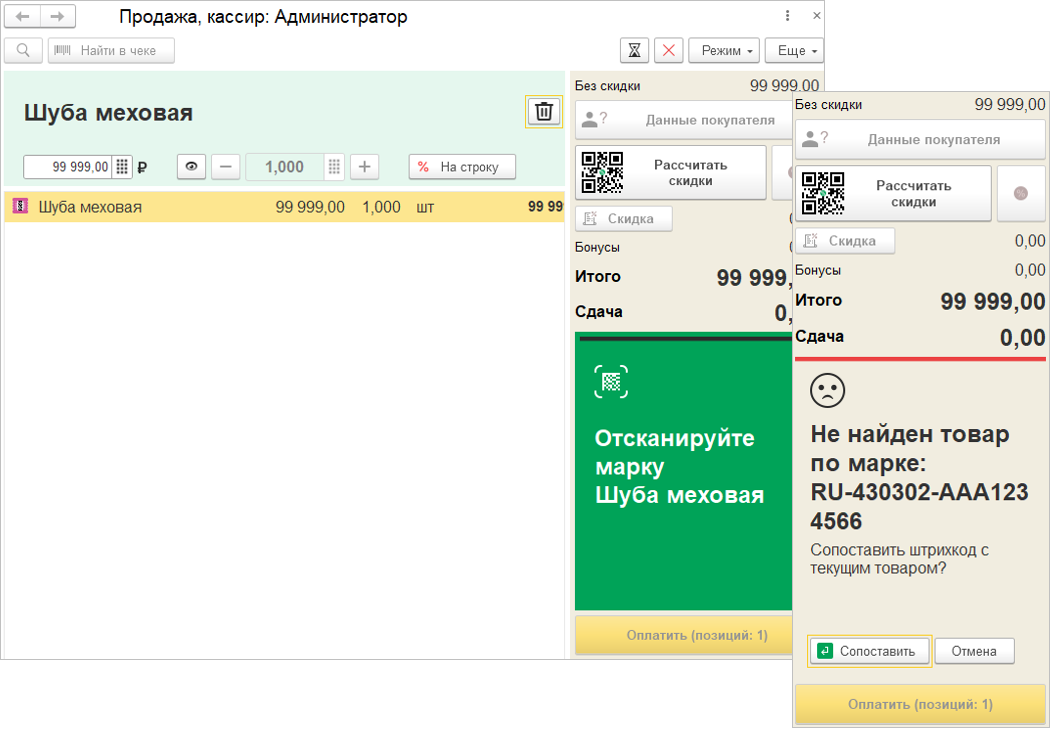 Реализован сценарий продажи изделий маркируемых средствами идентификации без использования контрольных марок. Теперь, если серийный учет выключен, то можно отсканировать КИЗ как марку товара, и сопоставить его с текущим товаром, если ранее он не был заведен в «Штрихкодах упаковок и товаров».