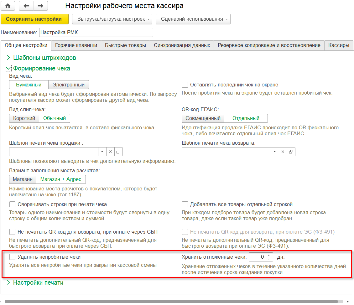 В настройки РМК добавлена новая группа "Настройки печати", где доступны