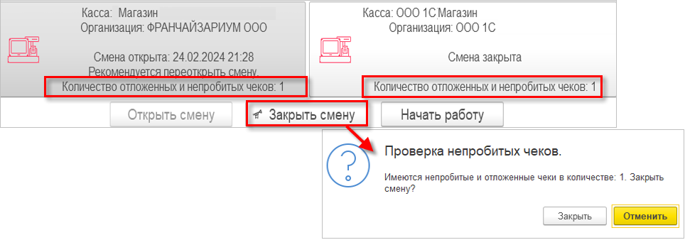 На экране закрытия смены теперь отображается информация о количестве непробитых и отложенных чеков за смену. При попытке закрыть смену на кассе, в которой предполагается какое-то действие с чеками, будет задан уточняющий вопрос.