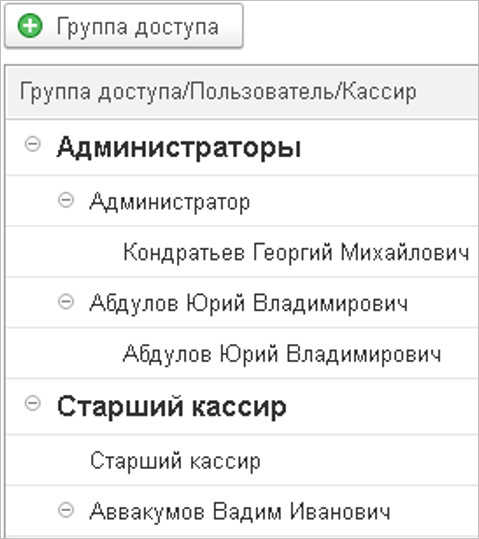 Вторая часть таблицы - дерево групп доступа, которое разделено на три уровня. Первый – запись элемента справочника «Группа доступа», второй – это пользователь, который добавлен в группу доступа первого уровня, третий уровень – это кассир, которому соответствует запись персонального кода.